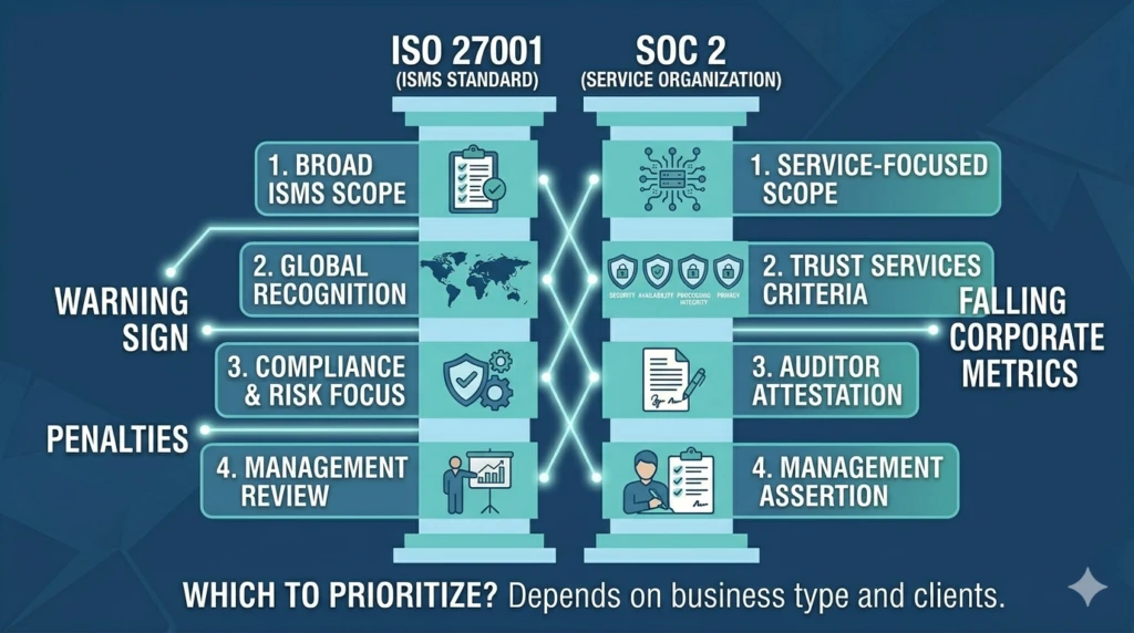 Compare ISO 27001 and SOC 2 certifications to determine which is right for your business — covering scope, cost, timeline, and market requirements.